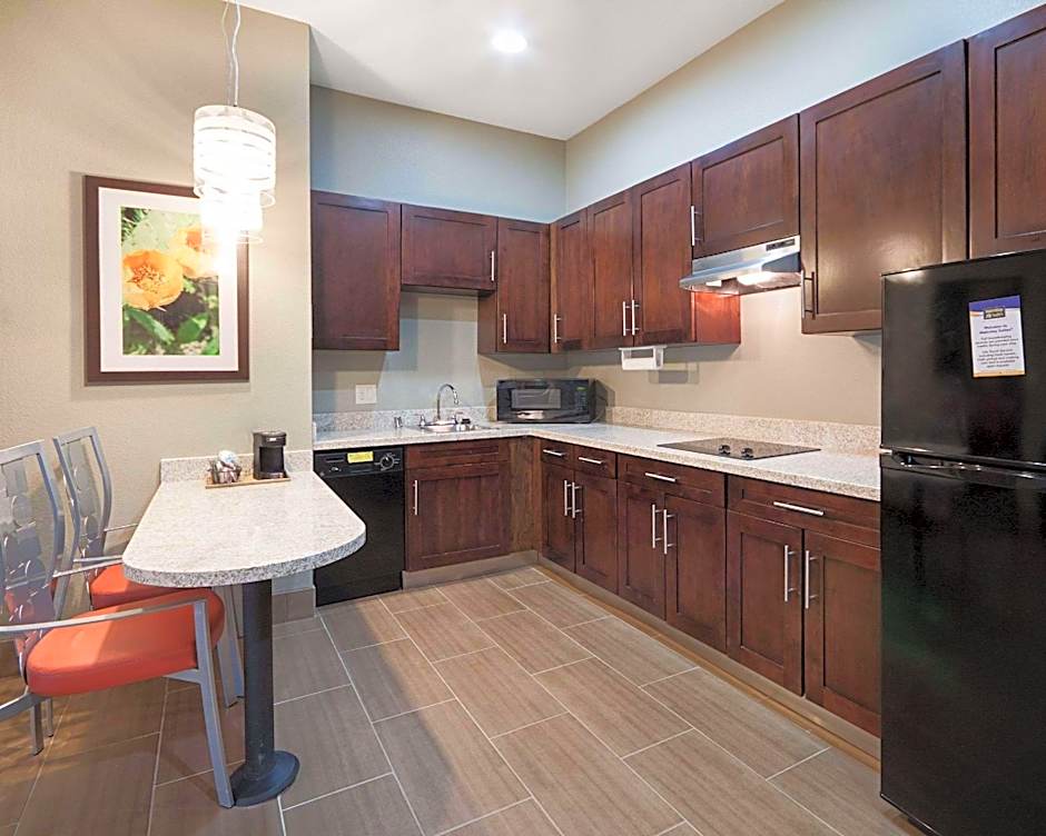 This king room features a full kitchen with dishwasher and refrigerator. A flat-screen cable TV with satellite channels offers in-room entertainment. The private bathroom comes equipped with a hairdryer.